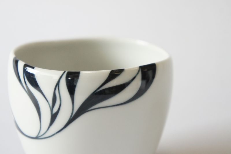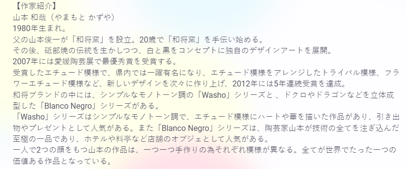 砥部焼の伝統を生かしつつ、白と黒をコンセプトに独自のデザインアートを展開。
