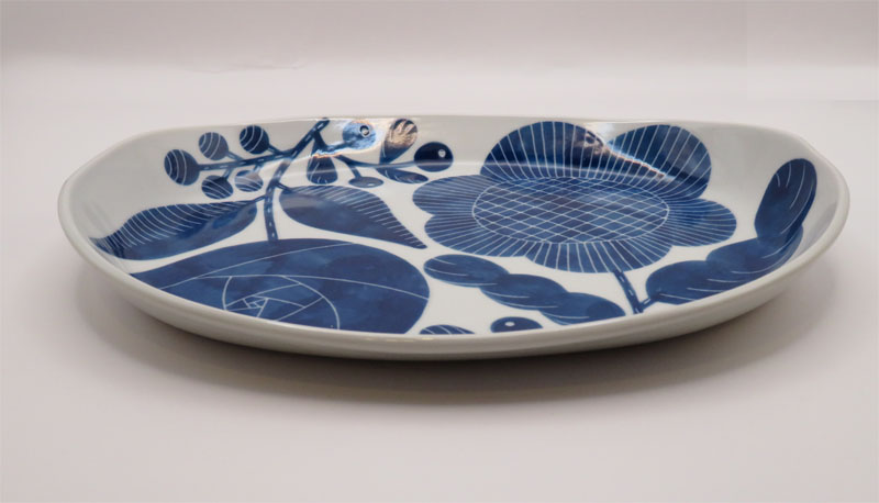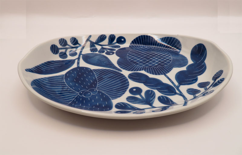 搔き落とし 花の楕円皿 大(青)