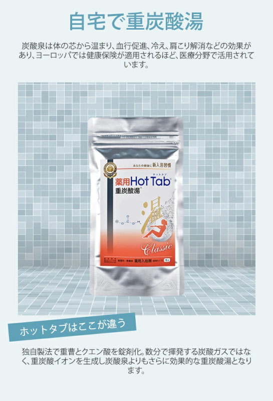 ・使用36℃~41℃のぬるめのお湯に、約160Lに3錠(約200Lに4錠)を目安に溶かしてご使用ください。重炭酸の溶けたお湯にゆったり15分以上浸かる「重炭酸温浴法」がおすすめです。ぬるめのお湯でも体の芯から温まり、入浴後も効果の持続を体験できるのがホットタブの特徴です。