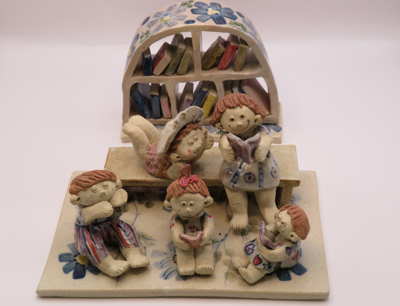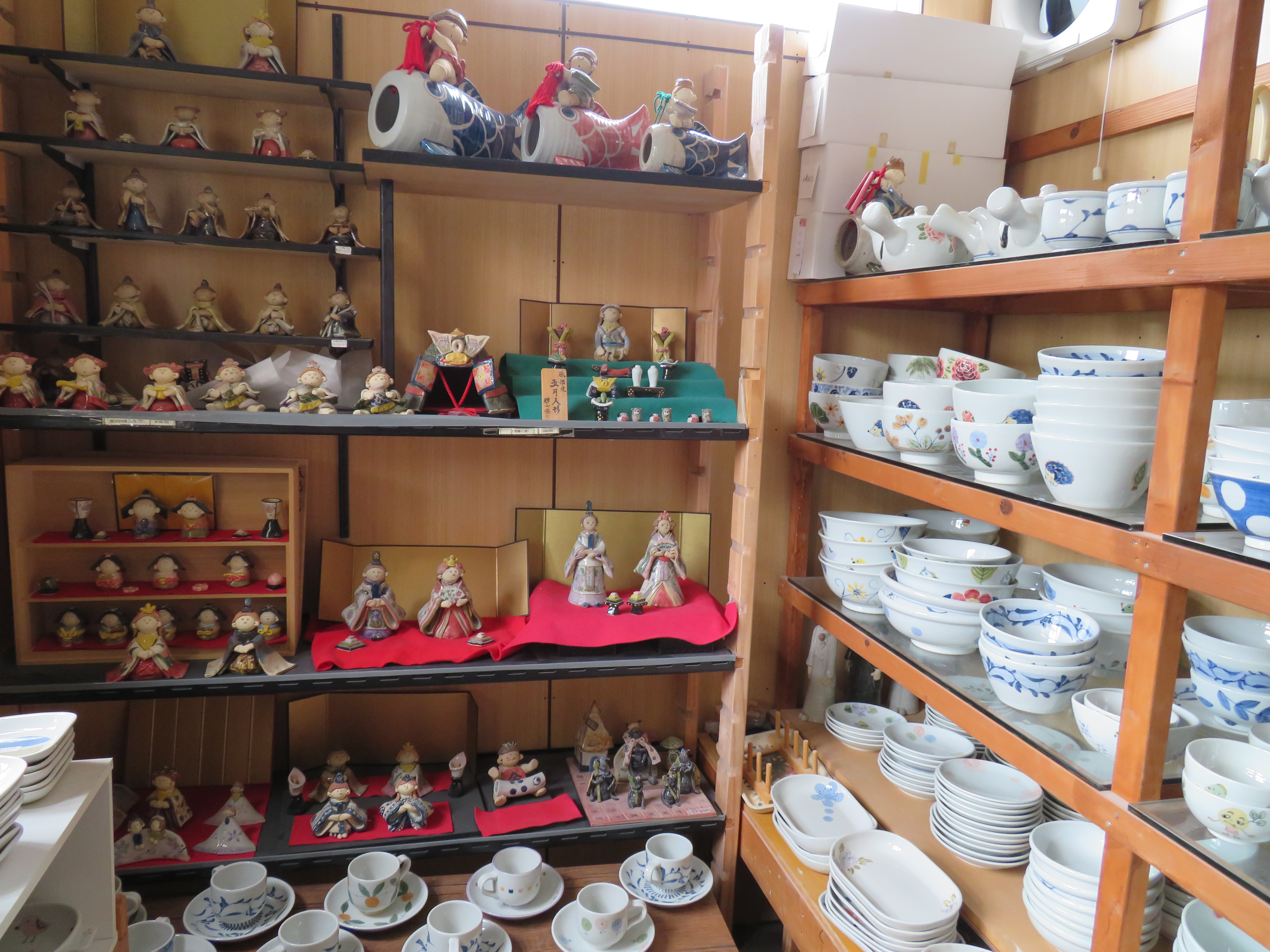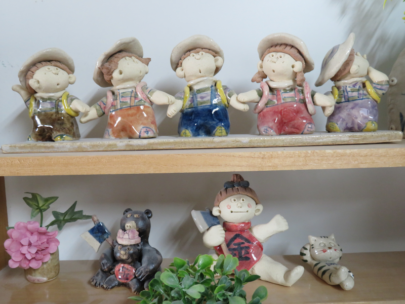 和紙染めによる「和紙花」シリーズや、砥部焼らしい唐草などの自然モチーフのものが多く、土のやさしさや温もりを感じられる器作りをされている窯元です。また、ギャラリーでは、道路に面した小窓から、くに子さんが作るくに子人形がお出迎えしてくれます。