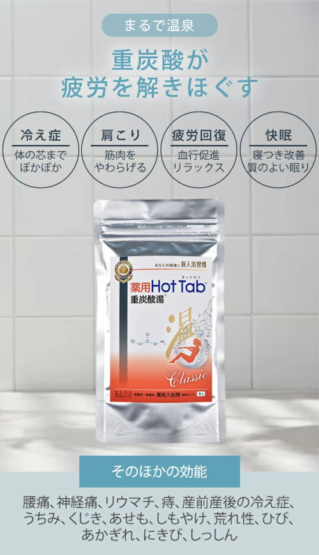 ・使用36℃~41℃のぬるめのお湯に、約160Lに3錠(約200Lに4錠)を目安に溶かしてご使用ください。重炭酸の溶けたお湯にゆったり15分以上浸かる「重炭酸温浴法」がおすすめです。ぬるめのお湯でも体の芯から温まり、入浴後も効果の持続を体験できるのがホットタブの特徴です。