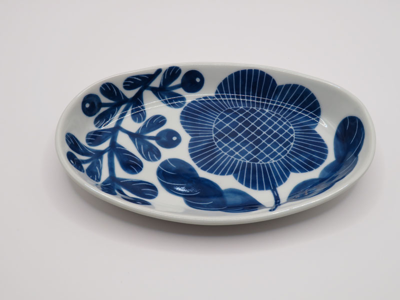 搔き落とし 花の楕円皿 小(青)