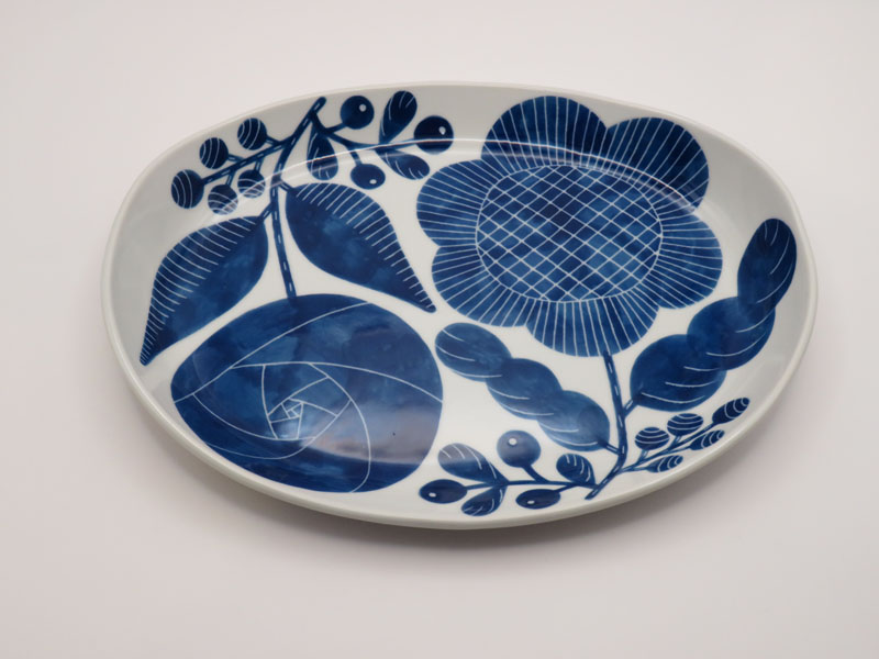 搔き落とし 花の楕円皿 大(青)